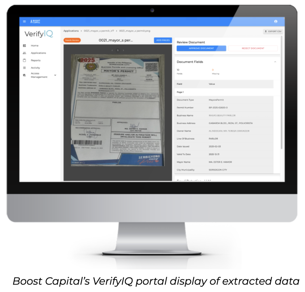 Using AI to process unstructured documents into structured data can save FSPs a lot of time. But if the data isn’t verified, its usefulness remains limited. AI can also assist in detecting fraud within documents. Boost Capital has already written about how we use AI to spot digital manipulation. In addition to detecting fraud, we also use AI for logical checks. Within one document, we can do math checks (for example, determining whether balances on a bank statement add up). Across an applicant’s documents, we can apply math checks (e.g., whether bank statement credits match business invoices) and other logic checks (e.g., whether the business’s name matches across documents). AI enables us to apply fraud detection across an applicant’s entire file, not just one document within it.