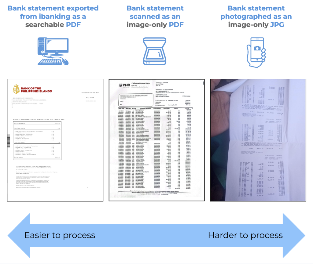 For image-only documents to be usable, FSPs need to further process them. Without a tech solution, FSP staff manually enter data from the document into their client management systems, which can take time. Most FSPs can’t afford to spend significant time on data entry, so instead of digitizing full documents, they usually enter only key data points.  For example, FSP staff might review the summary page of a bank statement and quickly scan transaction details on subsequent pages for red flags. Consequently, fraudulent transactions can slip through the review process. This also means FSP’s digital records remain sparse, impeding robust analytics (whether traditional, or powered by machine learning and AI) that could improve underwriting and product development to expand access to finance to new customer bases.