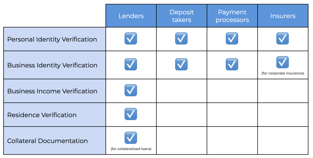 1.  Personal Identity Verification: Who is the customer? Who is the bank financing? Who’s using the e-wallet? Who’s getting insured? FSPs need to know if a person is legitimate, and if they have a history of illegitimate activity. This is required under Know Your Customer (KYC) and anti-money laundering (AML) requirements that regulators impose on FSPs around the world.
