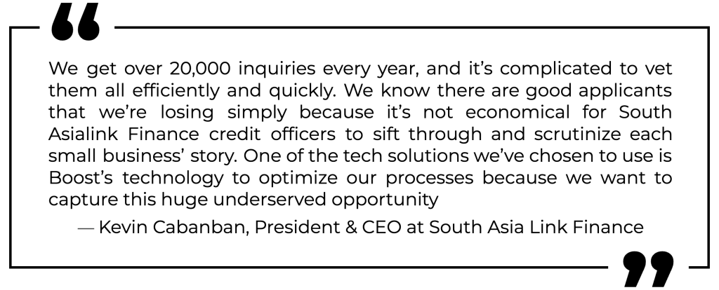 Although Boost Capital’s technology works across financial service sectors, by far the highest-demand service from small businesses and entrepreneurs is borrowing. A recent Boost Capital survey of 150 Filipino merchants found that access to loans dominated their motivation to use a digital application.