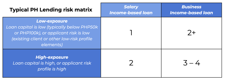 We typically find that lenders vary verification requirements depending on the income type of the applicant and the bank’s exposure level. If 1 represents lowest risk and 4 highest risk, with granular qualifiers like 2- and 2+, on average, FSPs would put the most verification scrutiny on higher-risk profiles. Using an example from the Philippines, lenders on average would rate risk as: